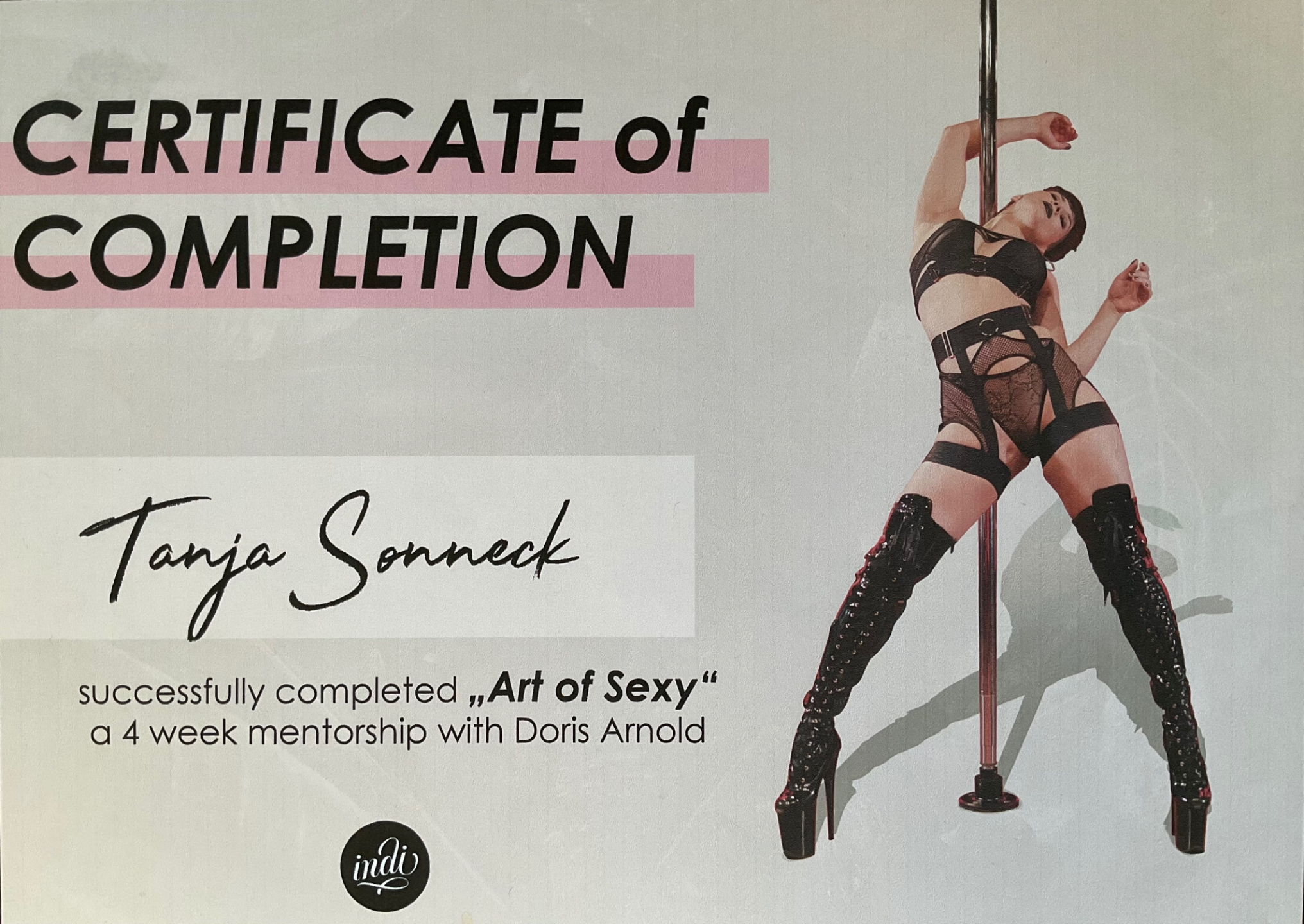 Mein Low Flow & Heels Poletrainer- Zertifikat von Jazzy K und India Bohanna